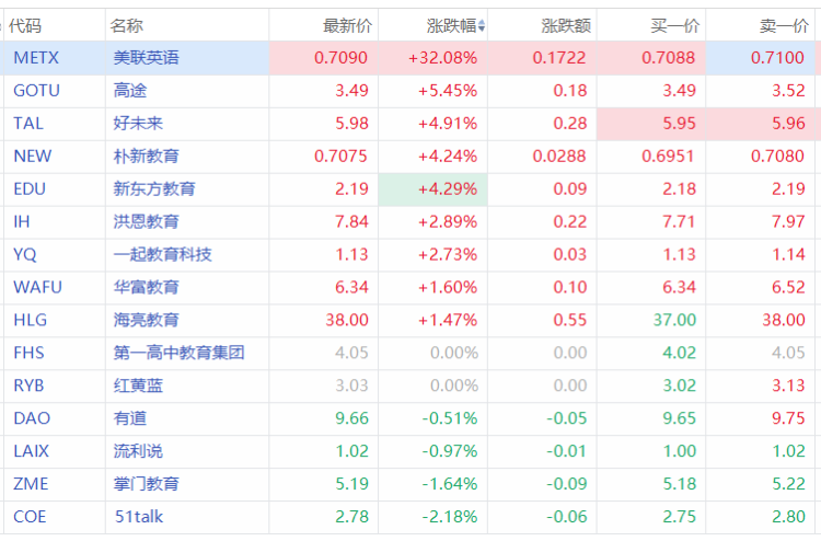 截至发稿,美联英语涨32.08%,高途涨5.45%,好未来、朴新教育、洪恩教育涨超4%。