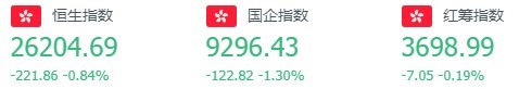 截至8月5日收盘,恒生指数跌221.86点或0.84%,报26204.69点,全日成交额达1617.46亿。国企指数跌1.3%,报9296.43点,红筹指数跌0.19%,报3698.99点。