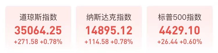 美股周四收高,纳指与标普500指数创收盘历史新高。道指涨271.58点,或0.78%,报35064.25点;纳指涨114.58点,或0.78%,报14895.12点;标普500指数涨26.44点,或0.60%,报4429.10点。