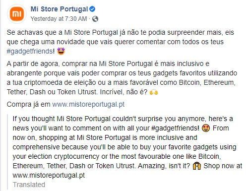 媒体:小米葡萄牙商店开始接受比特币等加密货币支付