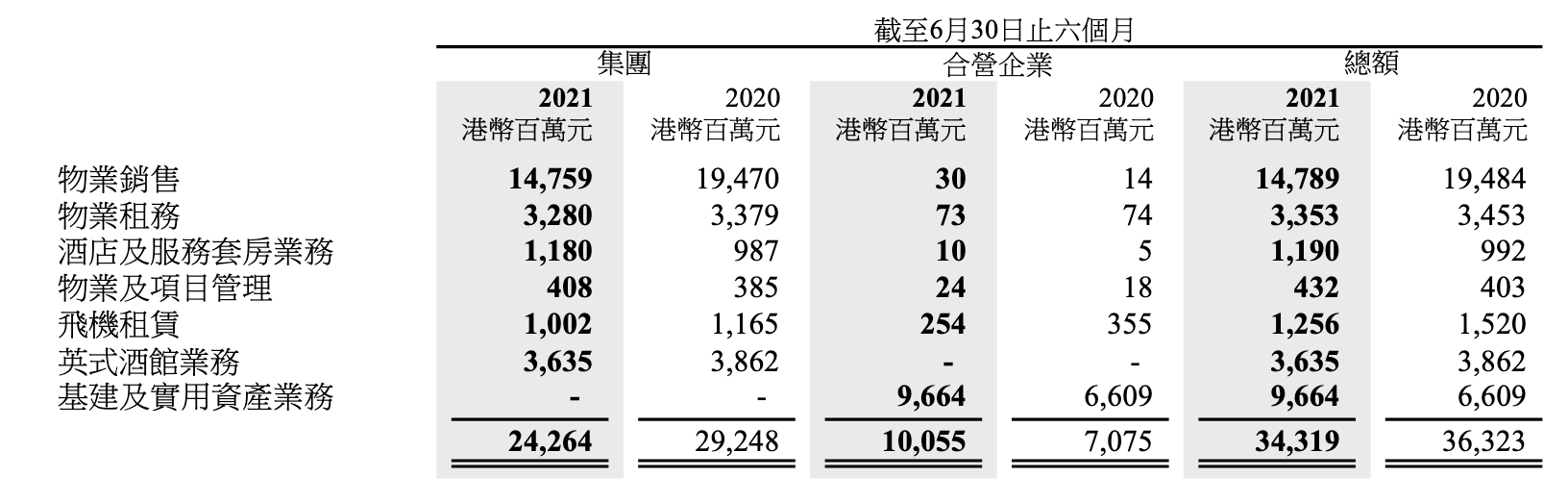 财报显示,今年上半年长实集团物业销售总额147.89亿港元,占比约43.09%。其中集团物业销售147.59亿港元,同比减少24.2%;合营企业物业销售3000万港元,同比增长114.29%。与此同时,物业销售贡献了79.17亿港元的净利润。