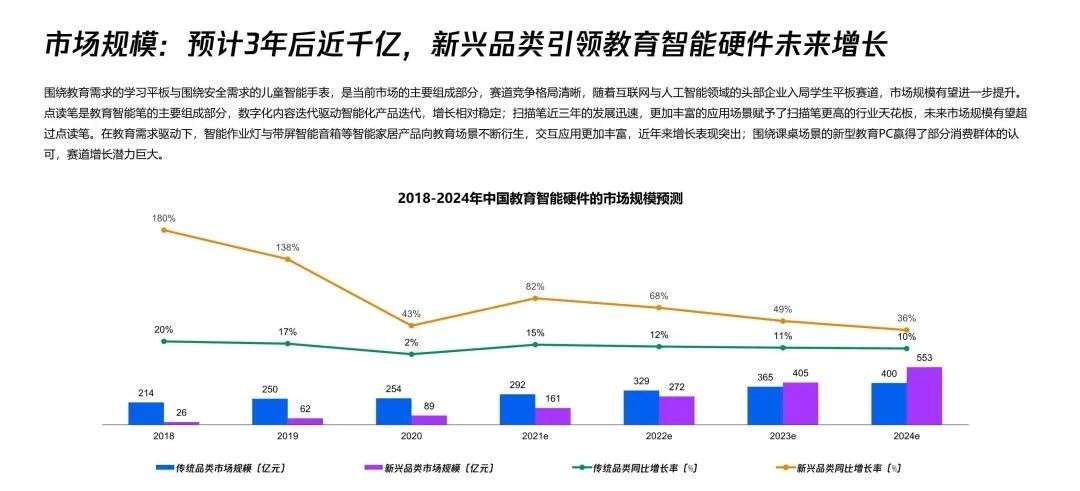 过去几年间,国内教育智能硬件市场快速增长。腾讯研究院《2021中国教育智能硬件趋势洞察报告》预测,2021年这块市场的规模将达到453亿元,比上一年增长约32%;2024年将接近1000亿元。此前大多数教育公司将K12学科类培训作为经营重点,并未在智能硬件投入太多资源,不过,在“双减”政策出台后,硬件业务的战略价值陡然上升。