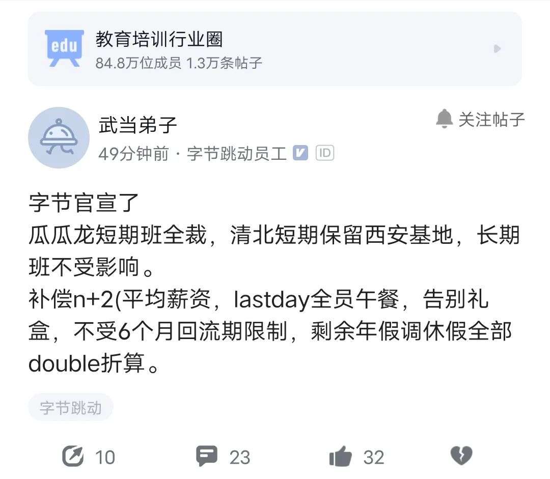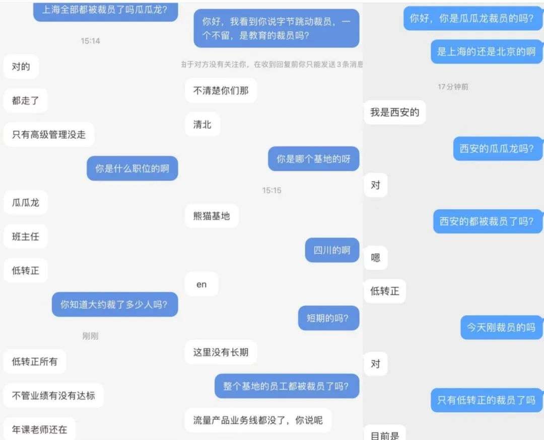 8月5日凌晨,一位脉脉认证为“字节跳动员工”匿名发帖称,今日上午,瓜瓜龙将开全员会,正式宣布裁员消息,低转正团队将被全员裁撤。中午时分,另一字节跳动员工在脉脉匿名区透露了这场会议的主要内容:瓜瓜龙短期班全员被裁,清北网校短期班保留西安基地,长期班不受影响,“Last day全员午餐,告别礼盒,N+2补偿,不受6个月回流期限制,剩余年假调休假全部double折算。”