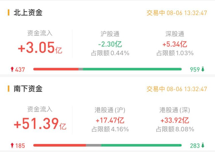 华盛资讯8月6日消息,目前,南下资金净流入51亿港元,其中港股通(沪)净流入17亿港元,港股通(深)净流入33亿港元。