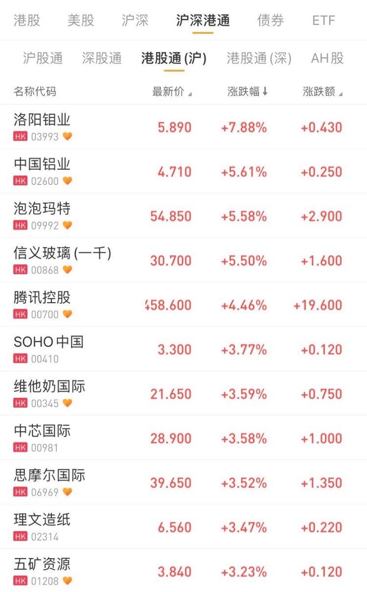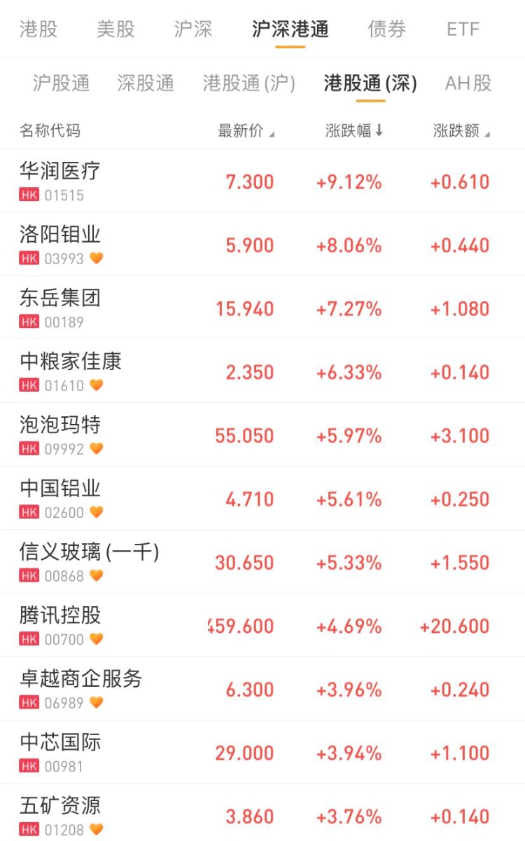 港股通(沪)、港股通(深)个股方面,华润医疗涨9%,洛阳钼业涨8%,东岳集团涨7%,泡泡玛特涨5%,腾讯涨4%。