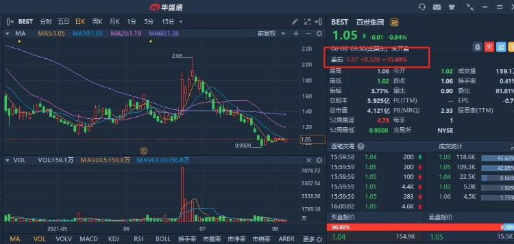 华盛资讯8月6日讯,百世集团(BEST)大涨30%;维珍银河(SPCE.N)盘前涨3.7%,第二季度营收远超预期,将重启航天销售计划。