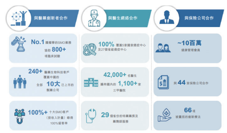 该公司目前经营三条业务线,包括医生研究解决方案(PRS)、药品福利管理(PBM)及供应商与支付方解决方案(PPS)。根据灼识咨询的资料,以2020年全年收入计算,公司的PRS经营着最大的肿瘤临床试验现场管理组织(SMO),PBM经营着最大的私营特药药房。截至2021年6月30日,通过公司中国100多个主要城市的医院、全科医生(GP)及专家的供应商网络合作伙伴为近一千万名加入了公司健康保险计划的会员提供PPS。