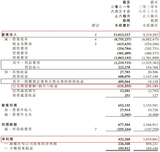 另外公允价值变动的损失比较多,为1.33亿元,2020上半年这一数据为收益2.92亿元。