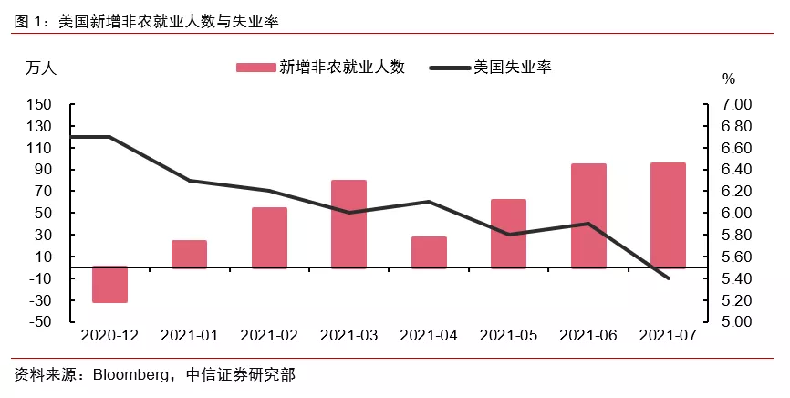 美国2021年7月新增非农就业人数94.3万(预期87万,前值为85万);失业率5.4%(预期5.7%,前值5.9%);薪资同比增长4.0%,环比增长0.4%;劳动参与率61.7%,前值61.6%。