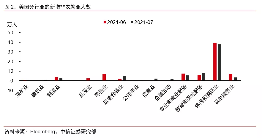 ▌ 7月非农就业数据如期改善。7月新增非农就业人数94.3万,延续了4月以来的上升趋势,也是今年以来就业人数改善幅度最大的一月。分行业看,服务业的改善趋势仍在进一步强化,其中休闲和酒店业新增38万就业,其中2/3来自于餐饮行业(+25.3万),住宿(+7.4万)、娱乐行业(+5.3万)也有明显改善。6月服务业累计新增就业65.9万人,延续了过去几个月的改善趋势。