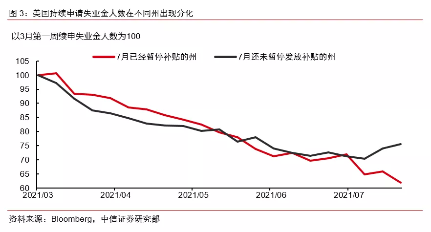 ▌ Delta病毒冲击有限,往后失业救济金退坡会进一步提升就业意愿。一方面,从疫情数据来看,虽然住院人数和重症人数有所上升,但医疗资源挤兑的情况远不如此前严重,因此未对美国经济造成更大范围的冲击,就业的改善趋势仍在延续。另一方面,随着8-9月美国失业救济金退坡,之前由于补贴太多导致就业积极性下降的问题有望得到缓解。目前已有23个州提前暂停了发放失业救济金,这些州的申请失业人数也的确有了显著改善。往后看,其他尚未宣布计划的州预计也不会晚于9月初之前暂停这一补贴。因此8-9月美国财政补贴的退坡会进一步提升就业意愿,劳动力供给的正常恢复有望加快。