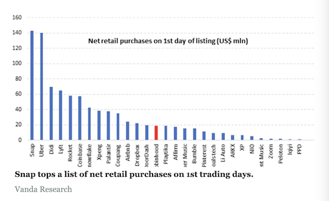不过,在其上市之初,来自散户的需求并不强劲。除了罗宾汉的客户会获得25%的IPO股份,其他散户的买入力度并不如Uber等公司上市之初的水平。根据提供散户净买入美股及ETF每日数据的VandaTrack数据显示,在IPO上市当日,散户仅买入了价值1885万美元罗宾汉股票,远低于不少包括Snap、Uber、甚至Coinbase等大型IPO上市当天的投资热情。比如在Uber上市首日,散户净买入近1.4亿美元的Uber股票,而在今年4月份Coinbase上市时,散户的购买额度也达到5740万美元。不过,随着罗宾汉股价在周二和周三分别呈火箭般暴涨24%和50%,更多散户跑步入场。根据VandaTrack数据,周三时,罗宾汉已是在散户平台上第三大被买入的股票,净买入额为5050万美元。