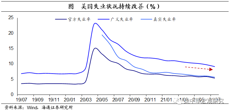 就业状况也在持续改善。7月美国官方失业率回落至5.4%,为去年3月疫情冲击以来新低;但广义失业率也回落至9.2%,也为去年3月以来新低;并且,考虑分类错误后,真实失业率也较上一月下滑(5.7%)。