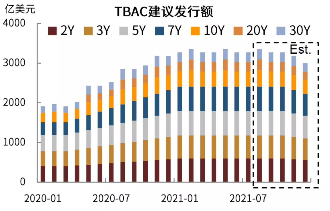 针对第一点,在美联储还没有明确Taper之际,美国财政部先给市场打了一剂强心针。最新公布的季度发行计划中,美国TBAC提及,此前为了满足债务上限约束,短期国债的余额压降非常明显,当前短期国债占所有政府债券余额的比例已经低于疫情之前,甚至原有的定期、可预测的发行模式也受到了挑战。鉴于当前财政和经济前景,TBAC建议自今年11月起,开始削减附息国债的发行规模,同时提升短期国债的净增(图9)。对于11月,TBAC建议将2Y、3Y、5Y国债发行规模各削减20亿美元(对比8月,下同),分别降至580亿美元、560亿美元和590亿美元;将10Y国债发行规模削减30亿美元至380亿美元,30Y削减20亿美元至250亿美元;对于7Y和20Y,则分别削减30亿美元和40亿美元至590亿美元和230亿美元。对于12月,TBAC建议将2Y、3Y、5Y国债发行规模进一步再各自削减20亿美元(相比11月),分别降至560亿美元、540亿美元和570亿美元;将10Y国债发行规模相比9月削减30亿美元至350亿美元,30Y削减20亿美元至220亿美元;对于7Y和20Y,则分别削减30亿美元和40亿美元(相比11月)至560亿美元和200亿美元。合计来看,整个四季度,附息国债的发行规模在10750亿美元,相比三季度的11080亿美元减少330亿美元;净融资层面,四季度预估为6322亿美元,相比三季度的6642亿美元减少320亿美元(图10)。附息国债压降的同时短期短期国债的净融资有所提升,四季度TBAC建议短期国债的净融资规模在708亿美元,相比三季度的88亿美元有大幅提升。为了能将短期国债的余额占比重新拉回并稳定在15%-20%的建议区间内,附息国债的这种削减将持续几个季度。这种发行结构的调整也意味着美债供给将由此前的缩短放长逆转为缩长放短,短期限债券供给相对增加,而中长期限债券的供给相对减少(图11)。