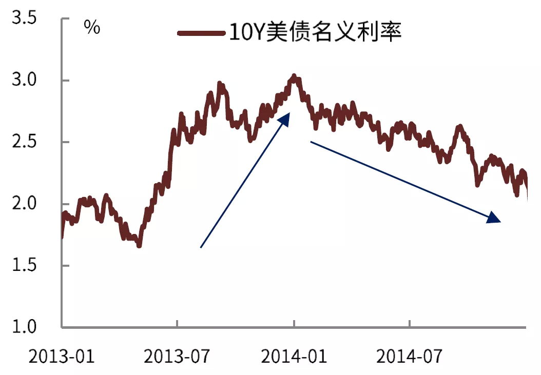 而针对第二点,过去美债长端利率走势上看,美联储货币政策预转向、以及转向的初期,情绪的确会推升长端率,但在这种担忧情绪得到充分消化后,长端利率往往会重新回落。比如2010年,美国从次贷危机中逐步恢复,2月19日美联储将贴现利率从0.5%上调25bp至0.75%,叠加3月第一轮QE正式结束,市场对流动性收紧的担忧曾一度推升10Y美债利率回升至4%附近,但4月之后又重新回落一路向下(图12)。再比如2013年5月时任联储主席的伯南克首次提及Taper后,市场剧烈动荡,10Y美债利率一路上行,但在2014年1月Taper正式开启后,利率反而步入下行通道,直到5月底市场开始计入加息预期后,利率才重新走高(图13)。所以从这两次市场的表现看,长端利率的初期上行更多是受到情绪的推动,属于对货币政策潜在收紧的正常反映,这也是我们为什么认为短端利率会抬升的根基。但对于长端利率而言,更像是恐慌情绪下交易盘仓位的自我调节,即市场在宽松货币政策边际退出之前,总体处于一个多头氛围,一旦货币政策可能转向的信号释放出来,这个利空会推动多头的反向平仓,出现“多杀多”的情形,踩踏交易下利率以一个比较快的速度抬升。而当这种恐慌情绪得到了完全释放后,投资者会重新聚焦到基本面上,重新审视长端利率的未来走向,毕竟除了货币政策外,经济动能增长等因素对长端利率走势也起到决定性作用。