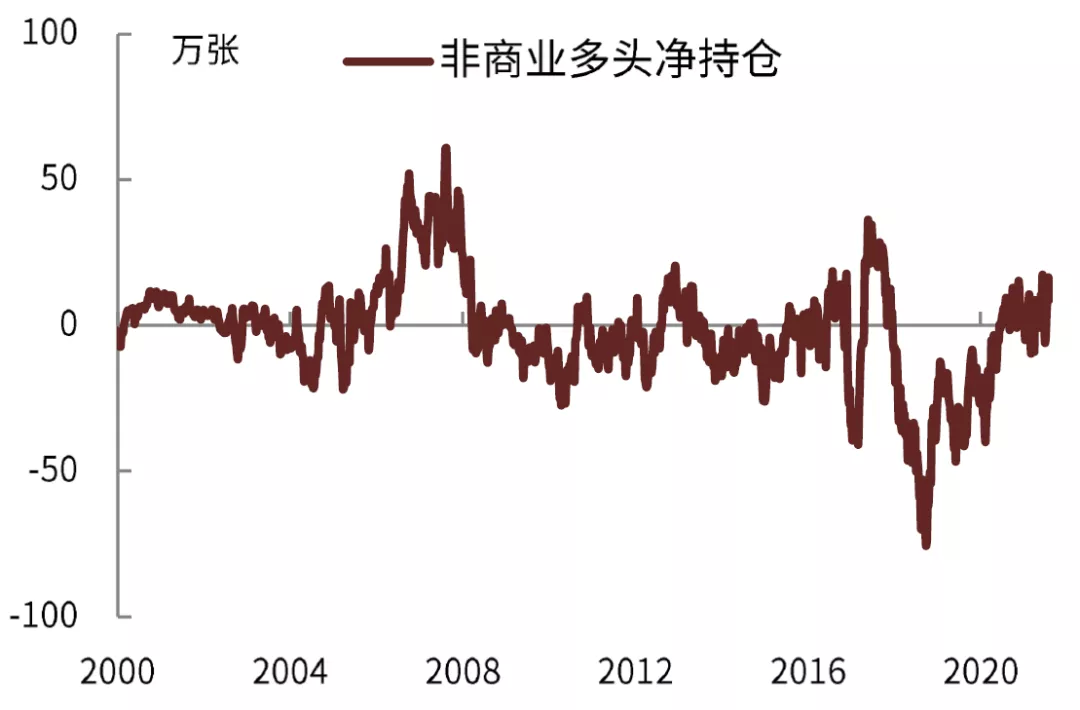 回到今年美国长端利率表现看,其实一季度我们已经经历过一轮美债利率上行的调整,而当时引发这轮调整的主要因素除了通胀预期走高外,就是对经济动能攀升下美联储货币政策提前收紧的担忧(图14)。也就是说今年市场这种所谓的、因货币政策潜在收紧而形成的“多杀多”已经出现过了。一季度末的时候,受亮眼的美国经济数据、美国疫情防控有成效、疫苗接种速度加快等因素影响,美债情绪从疫情最严重期间的多头氛围逐渐转向空头。而二季度,随着美国经济动能回落不及预期、疫情反复尤其是Delta变异毒株的快速传播、美债供给的缩量、财政存款的释放等,空头情绪开始被逐渐平抑,重新转回多头氛围。目前虽然利率回到了一个相对低位,但从10Y美债期货持仓数据看,非商业多头净持仓相比历史高位而言仍有一定的空间(图15)。也就是说当前这个点位上,市场虽然对美债长端利率不那么看空,但也绝对算不上是一个很强的多头情绪。而且市场其实已经对Taper有过多轮的讨论,预期打的比较充足。所以在这个背景下,即便美联储后续真的开启Taper,对投资者而言并不是个意外,对美债长端利率的推升可能也相对有限。
