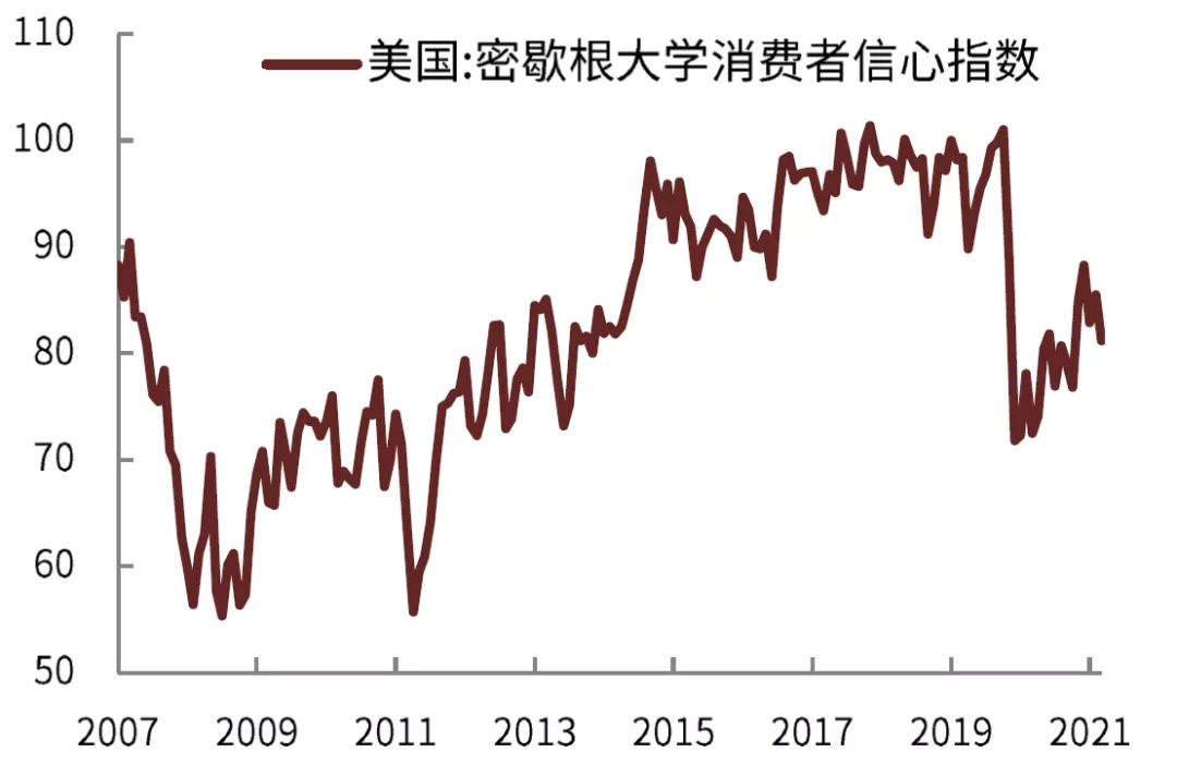 但爬完坡后,美国也会面临一个棘手的问题,就是当经济动能恢复到一定程度后,进一步的回升变得很难。其实这个问题不仅对美国存在,包括中国、全世界其实都面临这样的一个阻碍。因为目前疫情仍没有完全有效的方法去抑制,新型变异病毒的出现为疫情防控带来极大的挑战,各国疫情都出现不同程度的反弹。而与此同时,各国的财政刺激工具却在逐步到期。美国财政、货币政策都面临不同程度的约束。以美国工商业贷款为例,近期增速开始回落(图18)。去年疫情期间,美联储为应对疫情,对企业提供了一定的融资支持。但今年随着这些临时政策、临时工具的陆续到期,企业的融资端开始回落。再比如美国的财政补贴,也在逐步退出,比如对居民的补贴发放告一段落。而过去带动美国经济复苏的最主要推手便是消费(图19),尤其是耐用品消费。美国消费的走强又离不开居民补贴的发放。一旦对居民的财政补贴退出,后续包括耐用品、服务业等的复苏可能都会重新回落。从目前耐用品消费数据看,其实已经有见顶的迹象(图20)。毕竟耐用品的消费具备一定的周期性,诸如家具、家电等物品,并不需要时时进行更换。而服务业也面临疫情重新反弹带来的重新回落风险。更重要的一点,美国高企的通胀也会一定程度的抑制消费。7月密歇根消费信心指数已经出现了一定的回落(图21),反映出物价的快速上涨已经开始对居民消费端形成挤压。所以从上述几个角度看,财政补贴退潮、疫情反复、叠加通胀攀升,对美国经济增长贡献最多的消费和服务业也面临一定程度的放缓。
