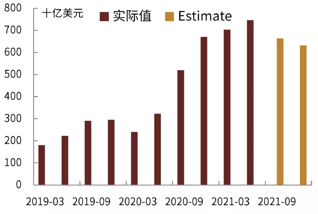 市场当前对美联储年底开始Taper的预期日渐走强,尤其是在8月5日非农就业数据出炉后。7月美国非农就业数据强劲,不但就业人数增长94.3万人,超过市场预期近10万人的水平(市场预期87万人),失业率也降至低于预期(图7)。此前尽管美国通胀一直高涨,但美联储对货币政策是否要提前收紧仍显得相对犹豫,主要就是受到了一直没有起色的就业影响。但目前来看,其实就业数据的恢复也比较快,在就业也朝着美联储目标值逼近时,美联储货币政策的收紧就变得更顺理成章了。可以看到8月5日就业数据公布后,美债利率也跟随出现了大幅的上行,从前一日的1.2%附近升至1.3%,反映了市场对美联储Taper预期的进一步走强。一旦美联储开始Taper,美元流动性的释放开始缩量,同时也意味着美联储货币政策的正式转向,短端利率会最先做出反应,开始抬升。