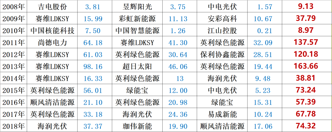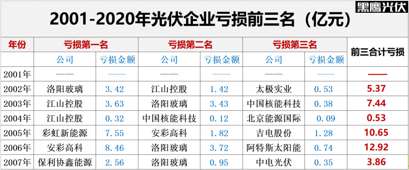 光伏产业确实是十年河东河西,曾经风光无限的企业,也完全有可能陷入亏损泥潭,甚至破产倒闭。如下表,在过去20十年里,一些明星企业也曾出现在“亏损前三”的名单中。产业的残酷,经营的分化,都可见端倪。