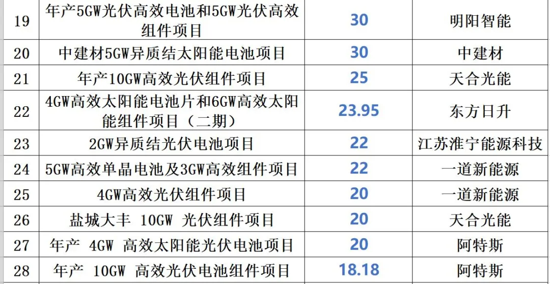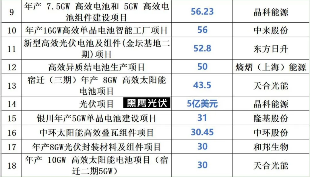 黑鹰光伏还发现,在过去的一年里,前十大光伏投资项目中还出现了新面孔,比如第五名的广东高景太阳能科技有限公司的“50GW光伏大硅片项目”,该项目计划投资170亿元;还有*ST海源的“10GW高效光伏电池和10GW高效组件生产项目”,项目投资预算为105亿元。