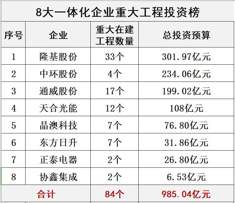 从投资力度看,截止2020年12月末,8家一体化龙头拥有84个亿元以上的光伏重大在建工程,工程总投资预算达985.04亿元,其中很多项目工程进度在80%以上。