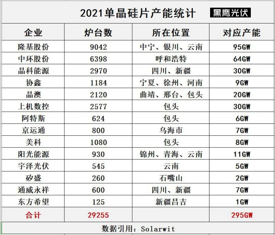B.截止2020年底,晶科投资350亿,隆基投资287.85亿,东方日升286亿,通威投资235亿,晶澳投资123.3亿,五家投资合计1282.15亿。以下是截止2021年年初统计的硅片产能统计,而后更多企业涌入硅片环节,扩产更为疯狂。