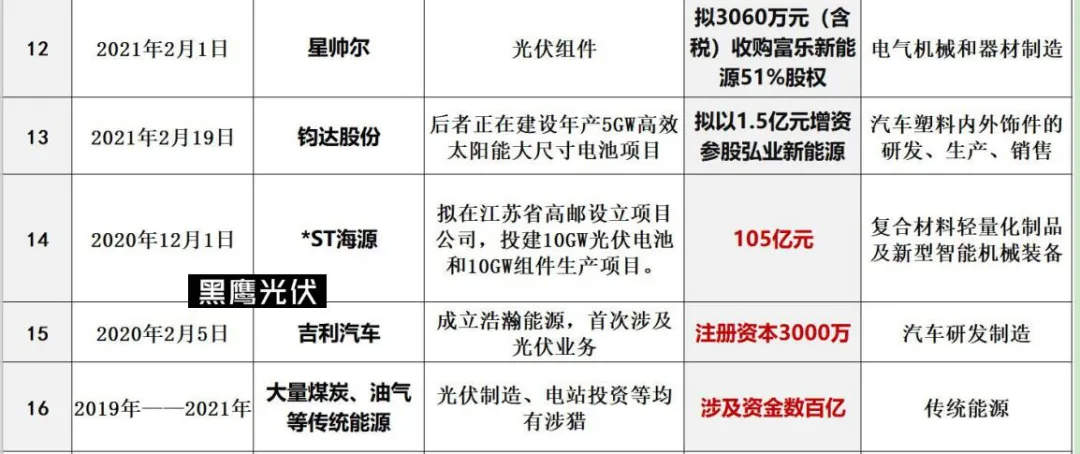 其四,过去一年半的时间,一些与光伏“八竿子打不着”的企业,开始跨界光伏。甚至,这些“跨界”者中,刚刚出现了吉利集团的身影——这是继比亚迪后,又一家整车制造企业进入光伏领域。