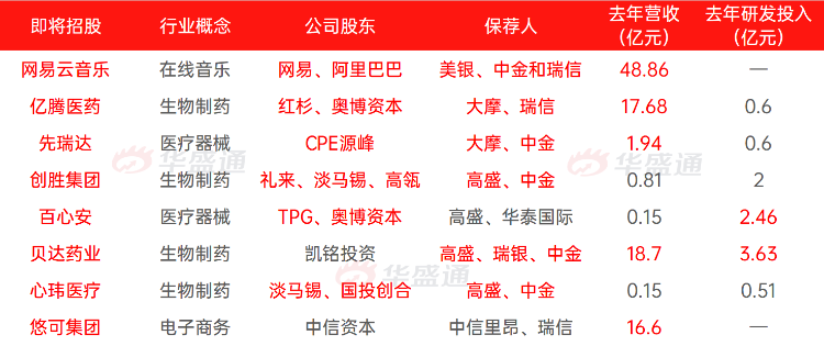 据港交所文件,目前有先瑞达、心玮医疗、创胜集团、百心安、贝达医药、悠可、亿腾医药和网易云音乐8只新股通过聆讯,目前正在预路演阶段,将于近期启动招股程序。