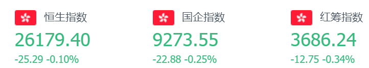 恒生指数跌25.29点或0.1%,报26179.4点,全日成交额达1480.41亿。国企指数跌0.25%,报9273.55点,红筹指数跌0.34%,报3686.24点。