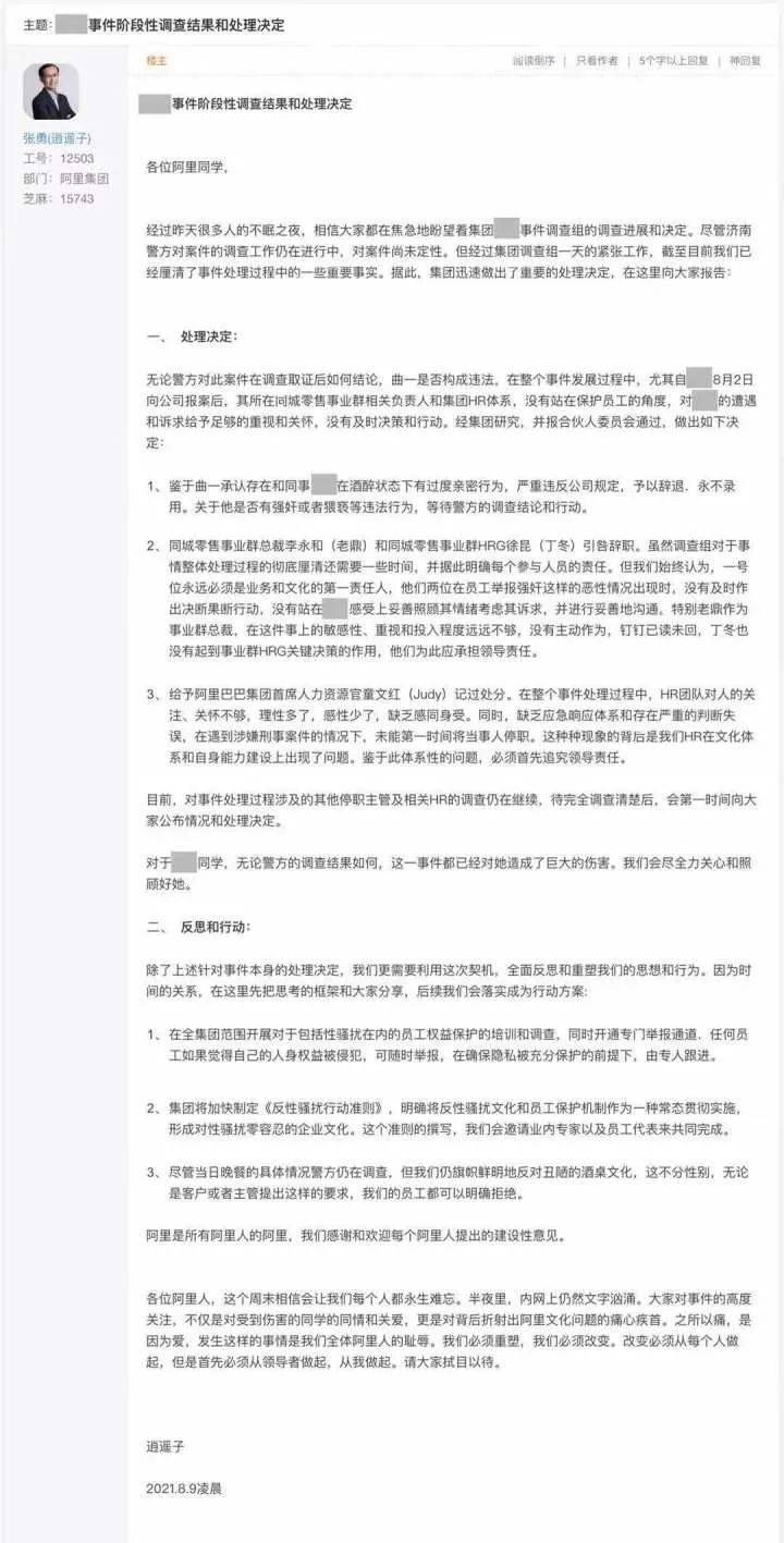 阿里巴巴董事会主席兼CEO张勇在阿里内网公布了“女员工被侵犯”的阶段性内部调查结果和处理决定:同城零售事业群总裁李永和和HRG徐昆引咎辞职,阿里巴巴首席人力资源官童文红记过处分,涉嫌男员工被辞退,永不录用,其是否存在违法行为,警方正在调查取证。