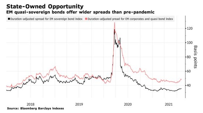 这种存在一定信用风险的债券的收益率高于主权债券,通常也被认为比纯公司债券更为安全。自2020年3月初疫情爆发导致各城市封锁以来,彭博巴克莱新兴市场公司和准主权美元债务的回报率为5.7%,而严格跟踪政府债券的可比指数的回报率为3.3%。
