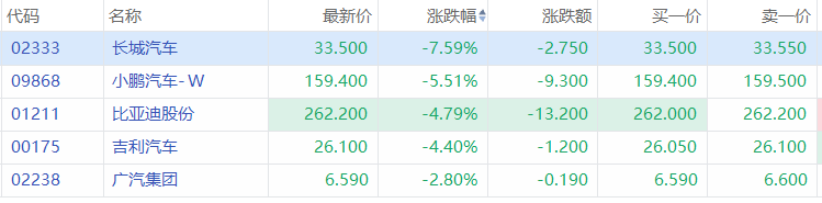 截至发稿,长城汽车跌7.59%,小鹏汽车-W跌5.51%,比亚迪股份跌4.79%,吉利汽车跌4.40%,广汽集团跌2.80%。