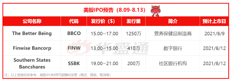 本周美股IPO市场预计将迎来3只新股,除由上周推迟至本周上市的营养保健品制造商The Better Being外,其余两只新增上市的个股均为银行股。好了,话不多说,来看看预计本周上市的新股都有哪些看点吧~