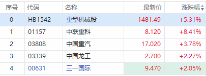 华盛资讯8月9日消息,2021年上半年机械工业经济运行形势信息发布会此前在北京召开。中国机械工业联合会执行副会长陈斌表示预计全年机械工业增加值、营业收入、利润总额增速可达6%左右。早盘重型机械股普涨,截至发稿,中联重科上涨8.41%;中国重汽上涨3.78%;中国龙工上涨2.27%;三一国际上涨2.05%。