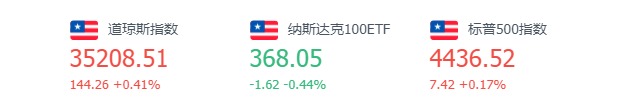 道指涨144.26点,或0.41%,报35208.51点;纳指跌59.36点,或0.40%,报14835.76点;标普500指数涨7.42点,或0.17%,报4436.52点。