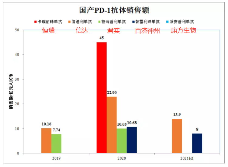 信达生物PD-1抗体上半年销售额13.9亿元(礼来口径),百济神州PD-1抗体上半年销售额8亿元,差距明显缩小。康方生物和正大天晴的派安普利单抗刚刚获批,国产PD-1抗体进入五家竞争时代。嘉和生物、誉衡药业、复宏汉霖、乐普生物也已经申报上市,很快将进入两位数时代。