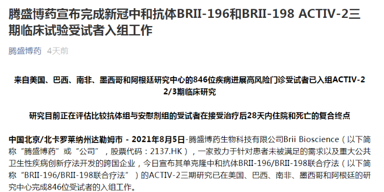 8月9日,港股腾盛博药(02137.HK)盘中一度拉升20%,连续2个交易日大涨,截至午间收盘累计涨幅37%。腾盛博药发布公告,宣布其BRII-196/BRII-198自研产品新冠中和抗体产品的ACTIV-2三期临床研究已在美国、巴西、南非、墨西哥及阿根廷的研究中心完成846位受试者的入组工作。