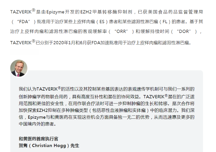 和黄医药(HCM)与 Epizyme, Inc.(EPZM)今日宣布开展合作,在大中华区进行 TAZVERIK® 的研究、开发、生产以及商业化。TAZVERIK® 是由 Epizyme 开发的 EZH2甲基转移酶抑制剂,已获美国食品药品监督管理局(“FDA”)批准用于治疗某些上皮样肉瘤(ES)患者和某些滤泡性淋巴瘤(FL)的患者。