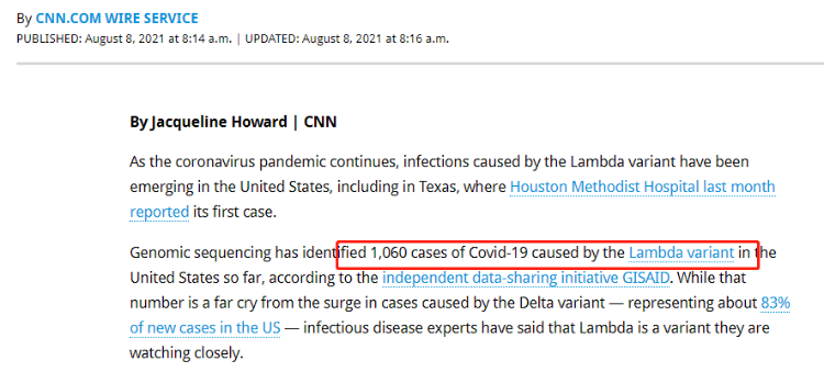 Lambda 变体于 2020 年 8 月在秘鲁首次被发现。东京大学的日本研究人员发布了一项Lambda变体研究,表明它具有高度的传染性,并对COVID-19疫苗更有抵抗力。