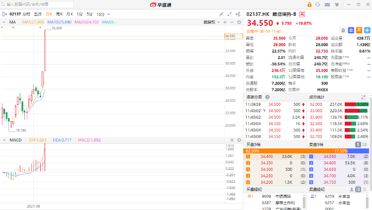 华盛资讯8月9日消息,次新腾盛博药-B今日强势走高,盘中大涨19.97%,现报34.55港元每股,最新总市值248.7亿港元,暂成交1.439亿港元,盘中创股价历史新高。