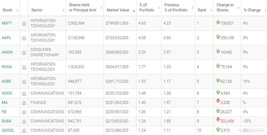 在前五大重仓股中,微软(MSFT.US)位列第一,持仓约295.24万股,持仓市值约7.998亿美元,持仓数量较上季度增长4%。