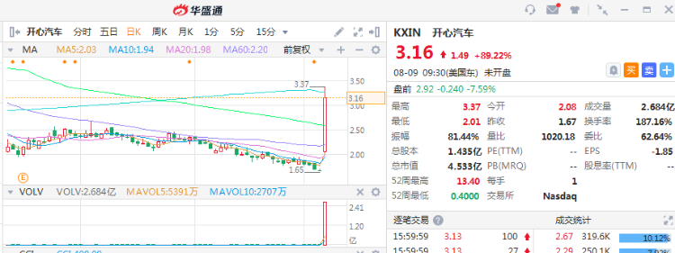 开心汽车(KXIN)盘前跌近8%,上周五收涨近90%。