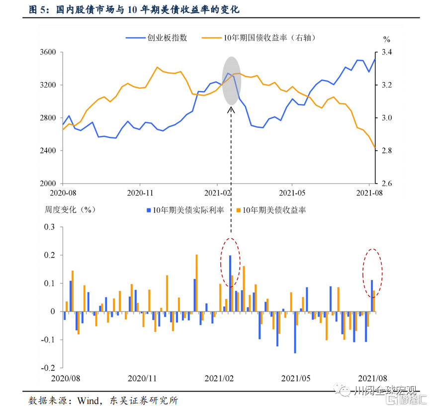 警惕宽松预期降温下,股债市场可能面临阶段性调整。海外方面,美国亮眼的就业和美联储鹰派的表态,使得长端美债收益率8月上涨的概率更大。国内方面,通胀居于高位,流动性宽松预期可能降温,此外由于媒体的渲染,政策不确定性也有所上升,股市尤其是成长股近期可能面临阶段性调整压力。相较而言,国内债市所受的影响可能更弱,不过美债收益率上涨和宽松降温的冲击,国内国债收益率近期顺畅的下跌行情可能面临挑战(图5)。