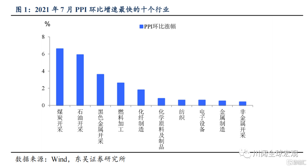 PPI同比再次触及年内高点,煤炭、原油行业发力。7月PPI同比再次触及9%的年内高点,略超市场预期。从细项上看,煤炭和原油是主要的驱动力(图1)。煤炭方面,近期“电荒”的频发凸显了动力煤供需的矛盾,尽管监管机构屡次出手要求稳供给、稳价格,但发电企业煤炭库存偏低是支撑煤炭价格的重要基础。原油方面,7月强劲的PPI主要反映的是6月原油价格的持续上涨,不过原油价格在7月初触及阶段性高点,预计8月PPI环比增速将受到油价的拖累。