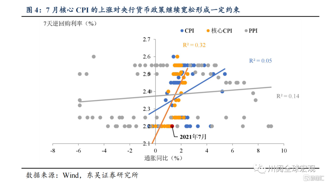 核心CPI持续上涨,短期货币政策选择面临更多的权衡。7月30日政治会议指出下半年货币政策要“助力中小企业和困难行业”,叠加此前央行全面降准的操作,市场对于下半年货币政策继续宽松充满期待。但我们此前一致强调,核心CPI也是央行货币政策尤其是利率政策关注的重要经济变量。7月核心CPI 的显著上涨会使得短期内央行在政策选择上更趋谨慎,近期再次降准或调整LPR的概率下降(图4)。