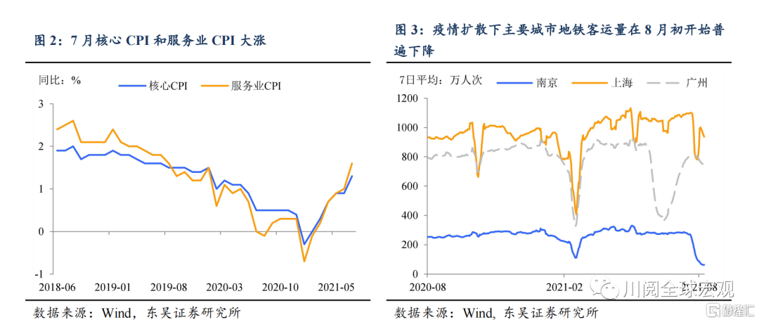 核心CPI同比年内首次站上1%。相较PPI,更值得市场注意的是核心CPI同比在7月录得1.3%,这是2020年5月以来首次站上1%。其中,服务价格同比增长1.6%,创下2019年8月之后新高(图2),由于暑期出行需求上涨且7月大部分时间疫情尚未明显扩散,飞机票、旅游和宾馆住宿环比分别上涨24.3%、7.3%和3.8%。不过7月底至今疫情的蔓延无疑将使得8月核心CPI环比增速放缓,但阶段性减速不妨碍我们对于年内核心CPI同比继续上涨的判断(图3)。