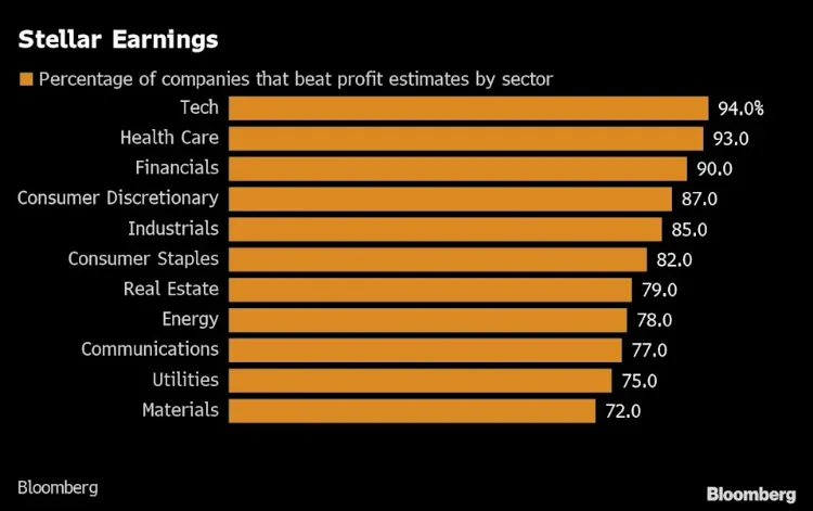 据彭博社汇编的数据显示,标普500成分股中85%的公司的业绩都超过了预期。平均而言,这些公司的股价在财报公布后应该会上涨0.2%。第一季度的趋势也大体类似,当时公司的业绩也不错,但股市平均下跌0.1%。