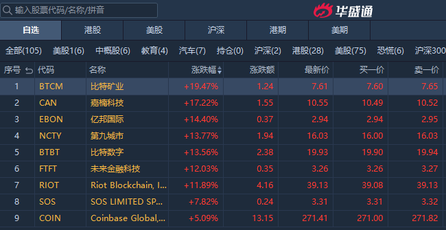 华盛资讯8月9日讯,美股早盘区块链板块走高。截至发稿,比特矿业(BTCM.N)涨近20%,嘉楠科技(CAN.O)涨17%,第九城市(NCTY.O)、比特数字(BTBT.O)均涨近14%,Riot Blockchain(RIOT.O)涨近12%、SOS(SOS.N)涨超7%,Coinbase(COIN.O)涨超5%。