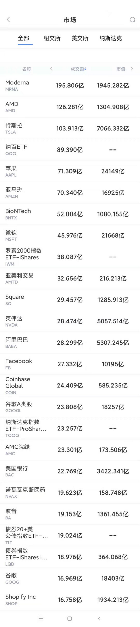 以下为美股当日交易最活跃的20只股票(按成交额):
