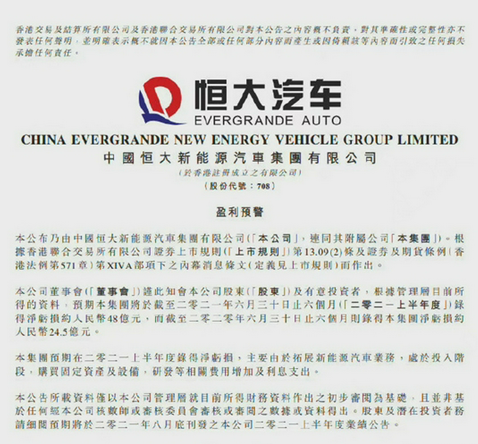 8月9日,恒大汽车公告称,预期今年上半年度录得净亏损约人民币48亿元,去年同期录得净亏损约人民币24.5亿元。预计今年上半年录得净亏损,主要由于拓展新能源汽车业务,处于投入阶段,购买固定资产及设备,研发等相关费用增加及利息支出。